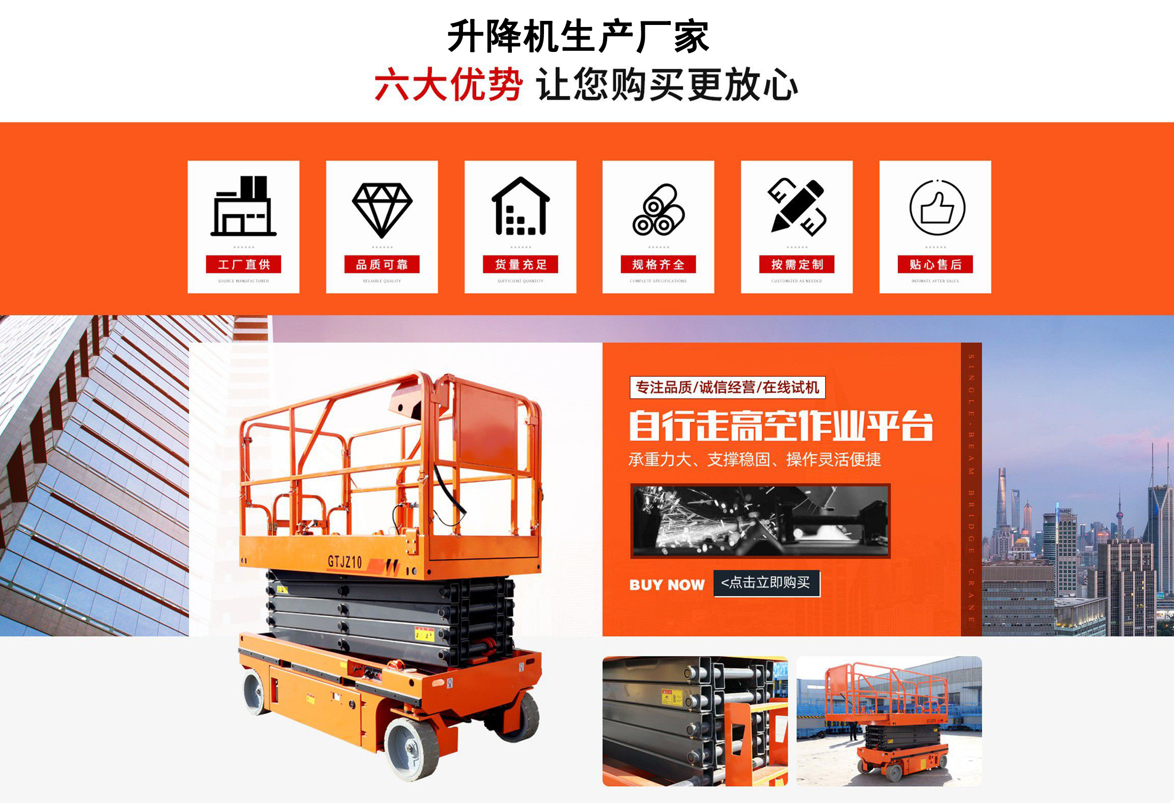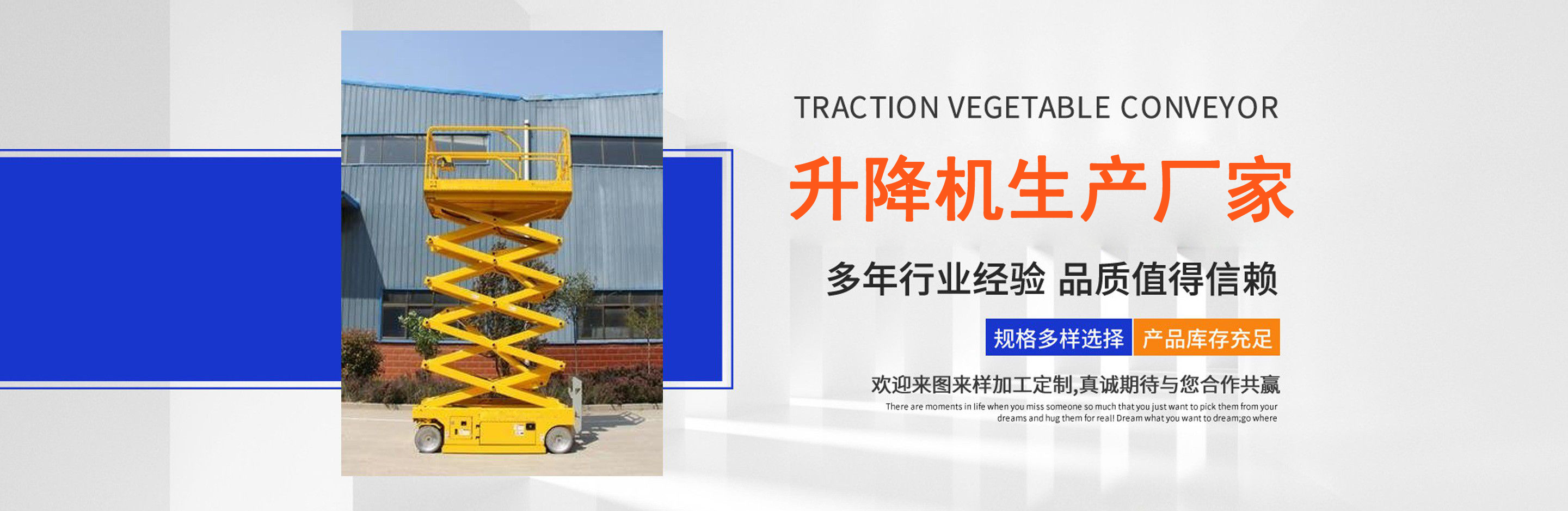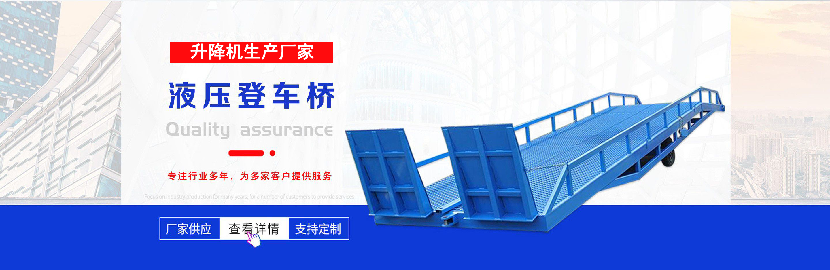 升降機(jī)生產(chǎn)廠家是專業(yè)從事升降平臺(tái),液壓貨梯,卸豬臺(tái),平板拖車,液壓提升機(jī),移動(dòng)式升降機(jī),升降平臺(tái)車,高空作業(yè)設(shè)備,貨梯廠家,液壓登車橋等升降機(jī)械產(chǎn)品制造十余年,服務(wù)過各大國(guó)內(nèi)外企業(yè)。 自公司創(chuàng)立以來,經(jīng)過長(zhǎng)期對(duì)液壓升降臺(tái)的研制和探索,積累了豐富的專業(yè)制造技術(shù)和寶貴經(jīng)驗(yàn)。憑借豐富的專業(yè)技術(shù)及不斷開拓創(chuàng)新的精神,現(xiàn)已成為專業(yè)于升降機(jī)械的公司。 長(zhǎng)期以來,憑借公司不斷的壯大及對(duì)液壓技術(shù)的不斷改進(jìn)和探索。能根據(jù)客戶不同的要求設(shè)計(jì)一套合理、完善的方案供客戶參考。現(xiàn)有產(chǎn)品:升降平臺(tái),液壓貨梯,卸豬臺(tái),平板拖車,液壓提升機(jī),移動(dòng)式升降機(jī),升降平臺(tái)車,高空作業(yè)設(shè)備,貨梯廠家,液壓登車橋等。本產(chǎn)品在各類工礦企業(yè)、港口物流以及其它領(lǐng)域均發(fā)揮著重要的作用。始終以“以信譽(yù)求生存、以技術(shù)求發(fā)展”為本廠的經(jīng)營(yíng)理念。只要你選購(gòu)我廠的產(chǎn)品,無論你身在何方都能得到我們迅捷優(yōu)良的服務(wù)。 公司自成立已經(jīng)來本著"團(tuán)結(jié)、求實(shí)、創(chuàng)新、互贏"的理念,以先進(jìn)的技術(shù)和服務(wù),為客戶建造滿意的產(chǎn)品。幾年來受到廣大客戶的好評(píng)。...